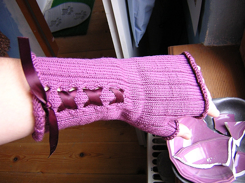 A true knithack, these lovely gloves are based on two patterns: color and ribbon from the lace-up fingerless gloves in Alterknits, rib pattern from Fetching.
