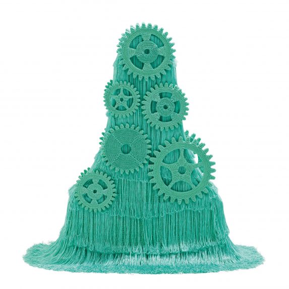 “‘Spinning Time Machine’ is a hand-made hybrid: part industrial machine, part traditional spinning wheel and part time machine, complete with cogwheels reminiscent of a mechanical clockwork. The machine spins visible time in string/yarn. Traditionally a time-consuming process, spinning here takes on a new dimension by producing a bright, visible representation of time. Although the soft, tactile piece does not actually move, it nevertheless generates a sense of motion and progression. Because all the components of the piece, from the string to the interior ‘mechanical’ structure, appear in the same mint-green colour, they appear to have been cut from the same material – perhaps the very fabric of time?” via Mindcraft Exhibition